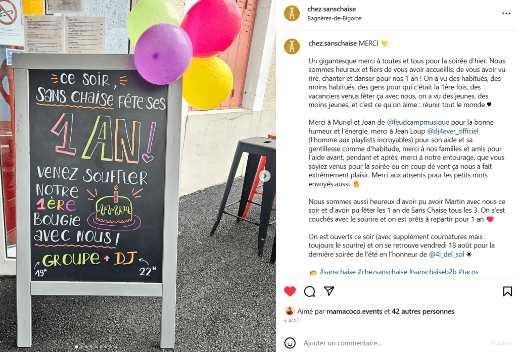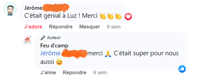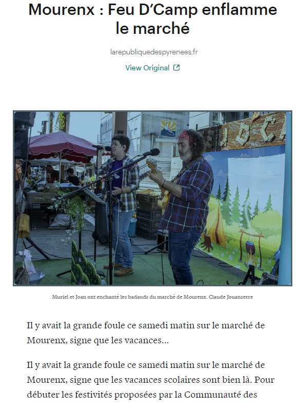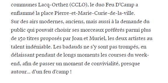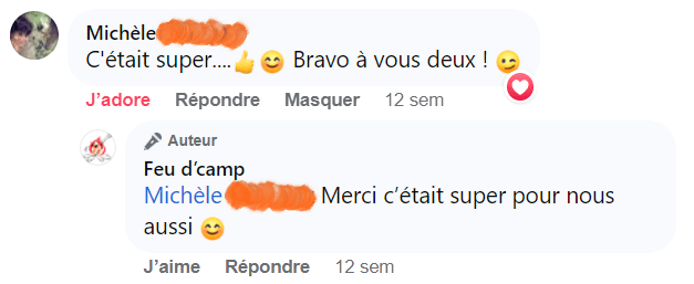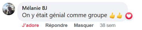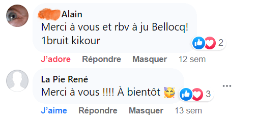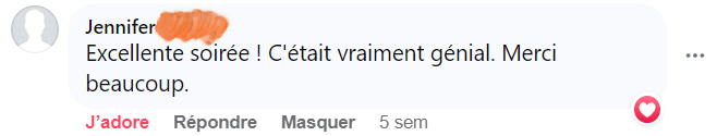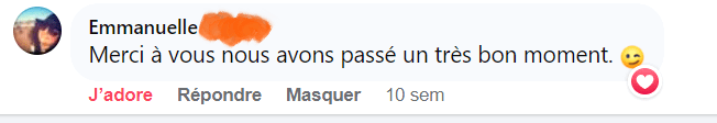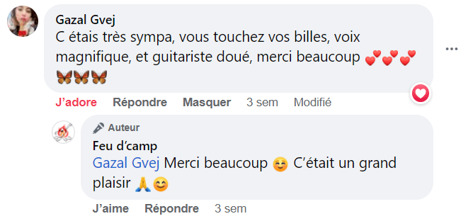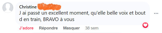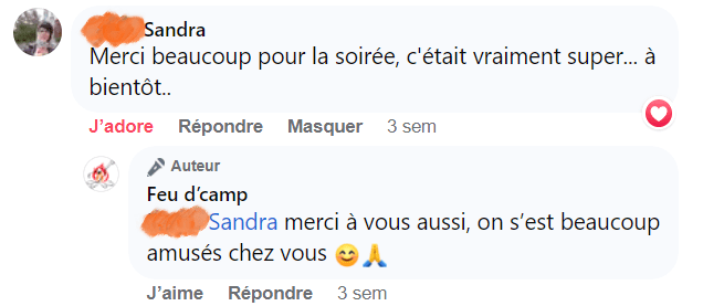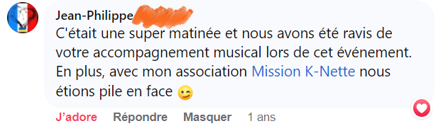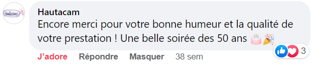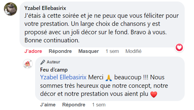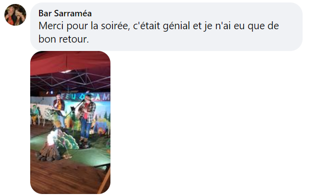 « Le concept est super pour mettre de l’ambiance et faire bouger et participer les gens. merci à vous 2 pour ce moment sympa, cela ce voit que vous avez mis du coeur dans votre groupe, vous ne venez pas juste proposer de la musique, vous êtes à l’écoute de votre public, le nom que vous avez choisi, le décor etc tout est en accord! »